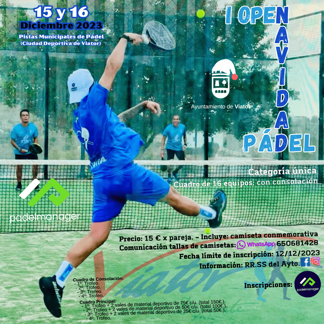 Bienvenid@s a las Pistas Municipales de Pádel del Ayuntamiento de Viator, nos encontramos en la Ciudad Deportiva de Viator (Avda. de La Selección Española de Fútbol 2010, s/n. 04240) Tlf. 950 306462 - e-mail: cdv2010@ayuntamientoviator.es Horario de Apertura: De Lunes a Sábados de 10:00h. a 14:00h. y de 16:00h. a 23:00h. Domingos y Festivos de 10:00h. a 14:00h. 3 Pistas de Padel. 20x10m2. c/u. - Cierre perimetral de Cristal y acero galvanizado. - Iluminación mediante proyectores. - Vestuarios. - Aseos. - Sala de Curas, Botiquín. Objetivos: • Promoción del deporte del pádel en nuestro municipio y contribuir a un mayor interés de la sociedad de este deporte; Ofreciendo un lugar de encuentro para los amantes de este deporte, facilitando el intercambio humano y deportivo. • Actividad formativa, lúdica, activa y participativa que son los términos que en mayor medida resumen el espíritu que este ayuntamiento a través de su área de deportes promueve la actividad física. • Con la organización de torneos, garantizamos la práctica de este deporte, desarrollando las cualidades físicas: resistencia, fuerza, velocidad, cualidades coordinativas y movilidad articular, así como el conocimiento de los fundamentos de la técnica del pádel. • Difusión de la cultura deportiva y los valores asociados a la igualdad, respeto, sacrificio, superación, solidaridad…