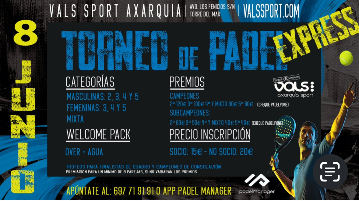 El centro de Vals Sport Axarquia dispone de varias pistas de pádel, además de pistas de tenis y un campo de fútbol césped natural. Forma parte de la cadena deportiva ValsSport que se reparte por toda la provincia.